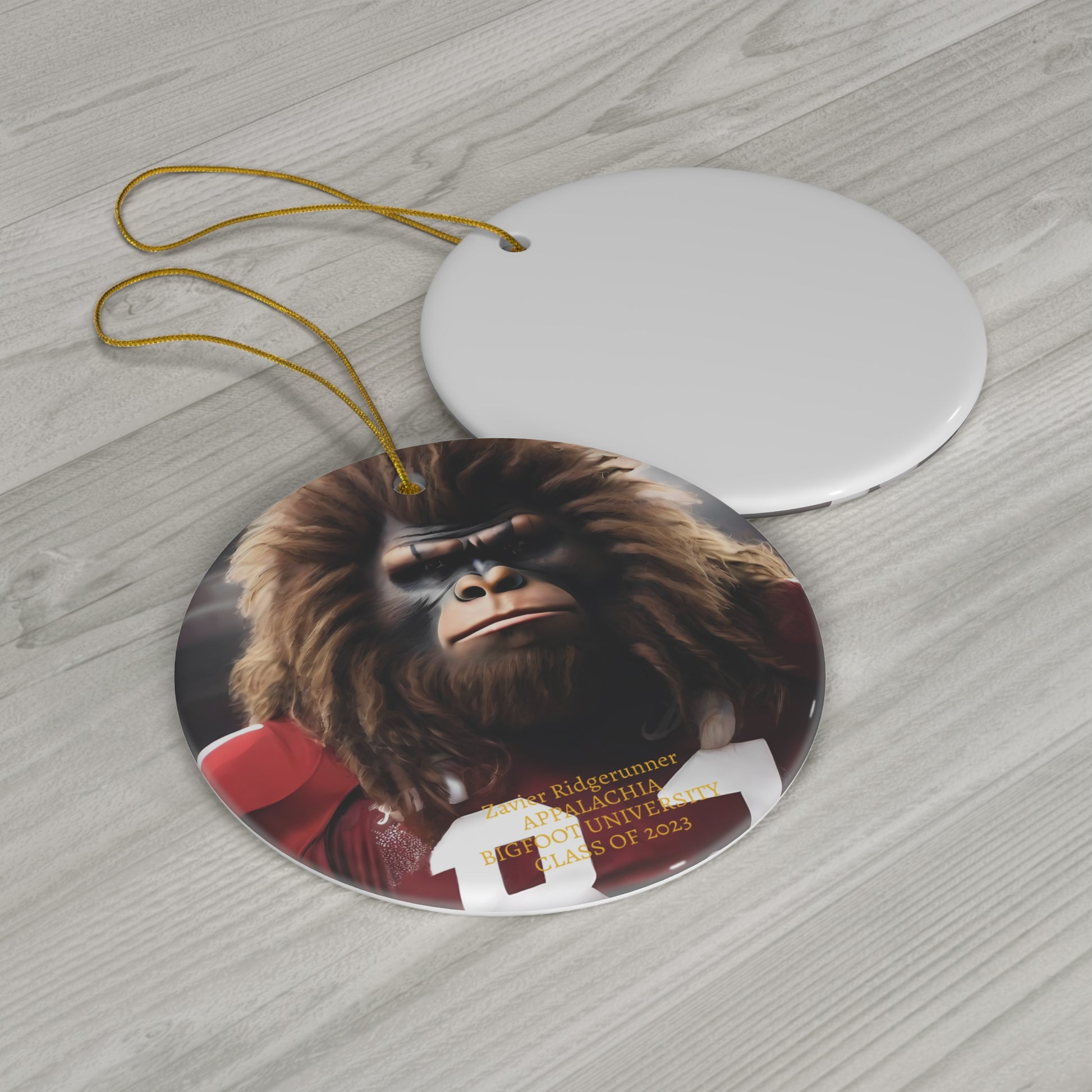 Zavier Ridgerunner, Appalacia Bigfoot University Class of 2023. Age 63 (same as 21 in human years), 7' 9", 520 pounds, plays right end for the ABU GRIZZLIES (Appalachian Bigfoot University). The first of our clan graduating from a school of higher learning. We are so proud of him. Our boys have decided they have had enough of wilderness living and want to explore the human world. But they aren't the first to enter your world, they have persued occupations in military, professionals, and teaching positions. You just haven't noticed them, YET. BIGFOOT HABITAT takes extra effort to create these beautiful orniments. These custom-made Christmas ornaments can be the perfect heirloom to use year after year, generation after generation. The ceramic ornaments are available in heart and round shapes for you to choose from. As the image didn't fit for the star and snowflake, they are on another product list. Needed to make sure the image covered all their points. These unique orniments can only be found on BIGFOOT HABITAT. They are not sold elsewhere. Don't settle on using the orniments just for Christmas, these special orniments can be shown all year round, on wall hangings, mobiles, on whatever your creative imagination can come up with.